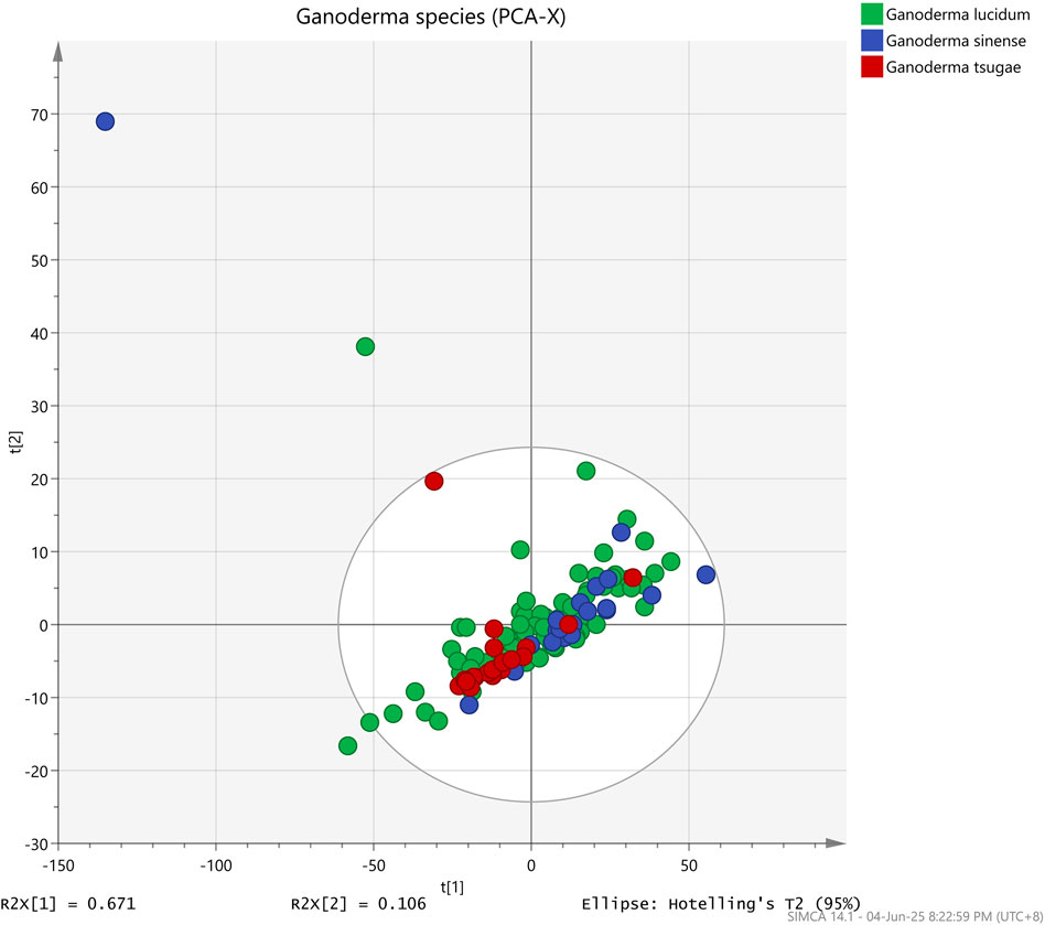 Figure 3. Unsupervised PCA score plot of three different Ganoderma species: (green) Ganoderma lucidum, (blue) Ganoderma sinense, and (yellow) Ganoderma tsugae.