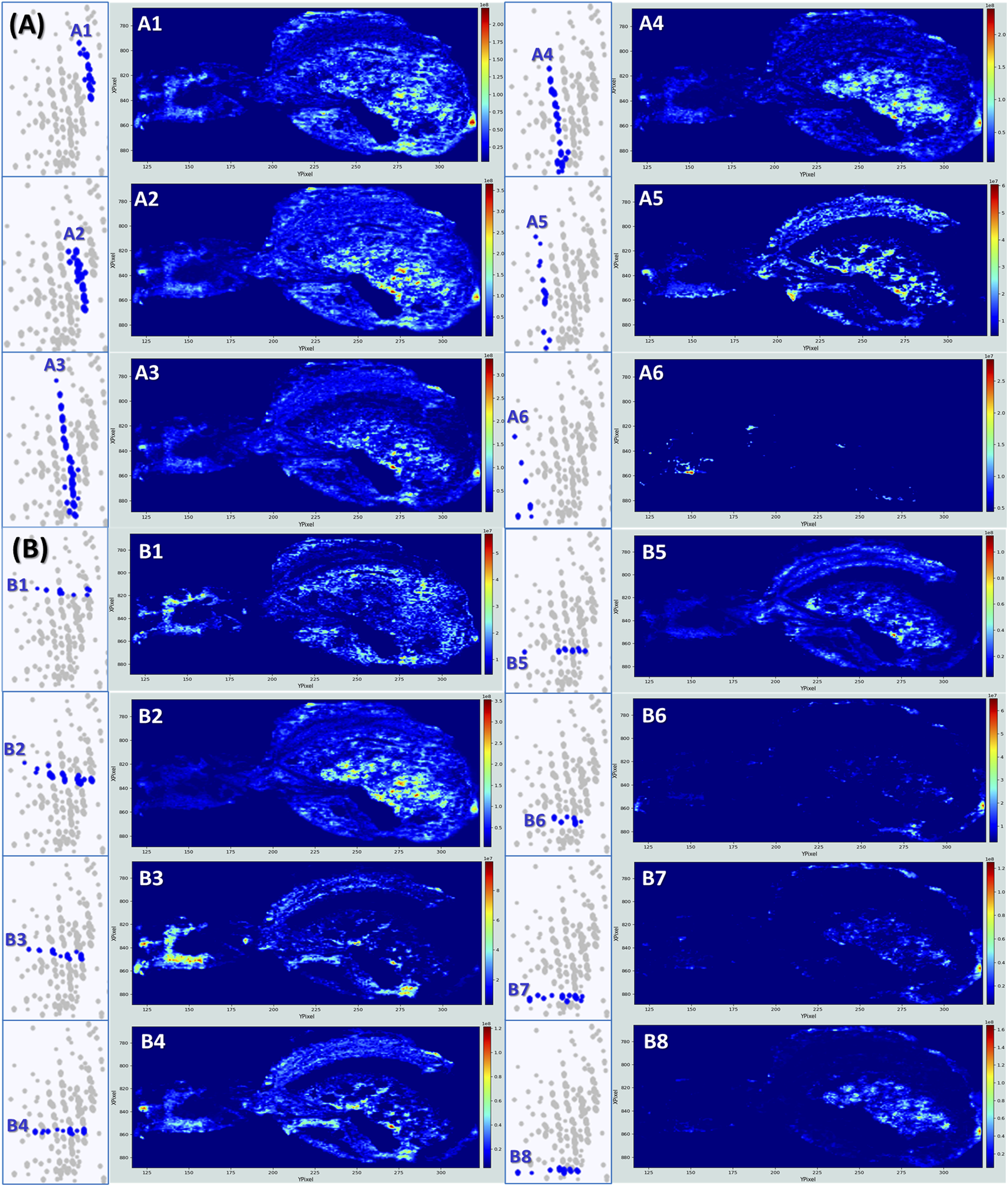 Group A6 is associated with molecules predominantly detected in the cephalothorax. While their identities remain unknown, their restricted localization raises the possibility that they may contribute to neural processes within the spider’s central nervous system.