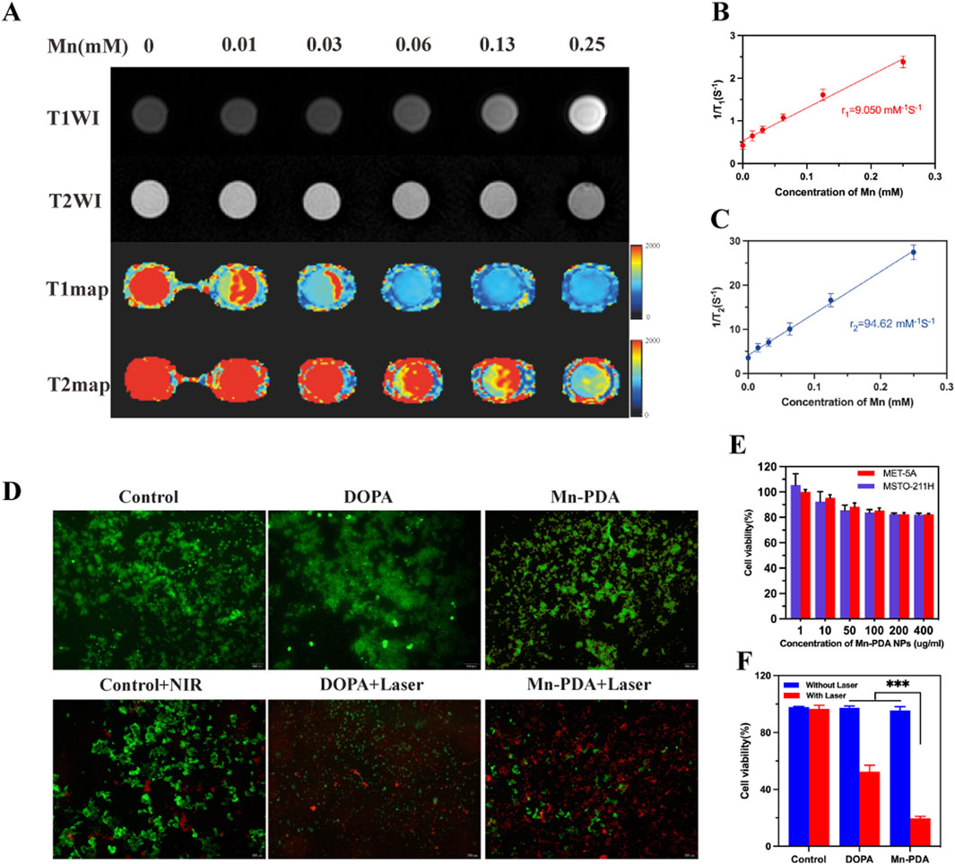 Figure 2. MR images and Cellular cytotoxicity of the nanoparticles. (A) T1WI, T2WI, T1map and T2map MRI images of Mn-PDA NPs with different concentrations at 3T field strength. (B) Corresponding Longitudinal relaxation rates (r1, s−1mM−1) and (C) transverse relaxation rates (r2, s−1mM−1) of Mn-PDA NPs. (D) Live/dead fluorescence staining (Calcein-AM/PI) of MSTO-211H cells post-treatments (Scale bar: 200 μm). (E) Viability of MeT-5A and MSTO-211H cells after 4 h incubation with Mn-PDA NPs. (F) Viability of MSTO-211H cells treated with DOPA, Mn-PDA NPs (±808 nm laser irradiation, 1 W/cm2, n = 3).