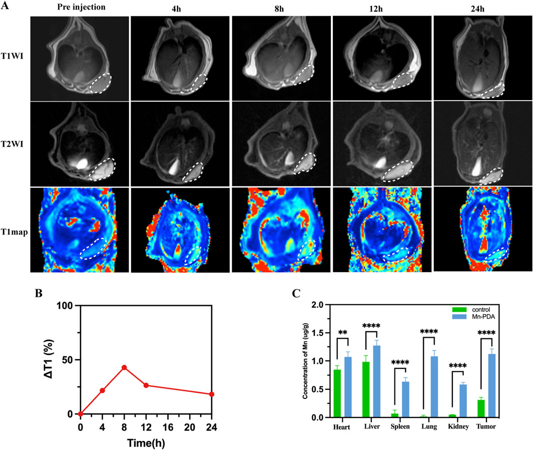 Figure 3. In vivo imaging effect of the nanoprobes in mice. (A) In vivo T1WI,T2WI and T1map MRI images of MSTO-211H tumor-bearing mice receiving an intravenous tail injection of Mn-PDA NPs. (B) ΔT1 of tumor from mice at different times post-injection of Mn-PDA NPs. (C) Mean manganese concentrations in major organs and tumors of tumor-bearing mice via ICP-AES at 8 h post-injection of Mn-PDA NPs and saline (control).