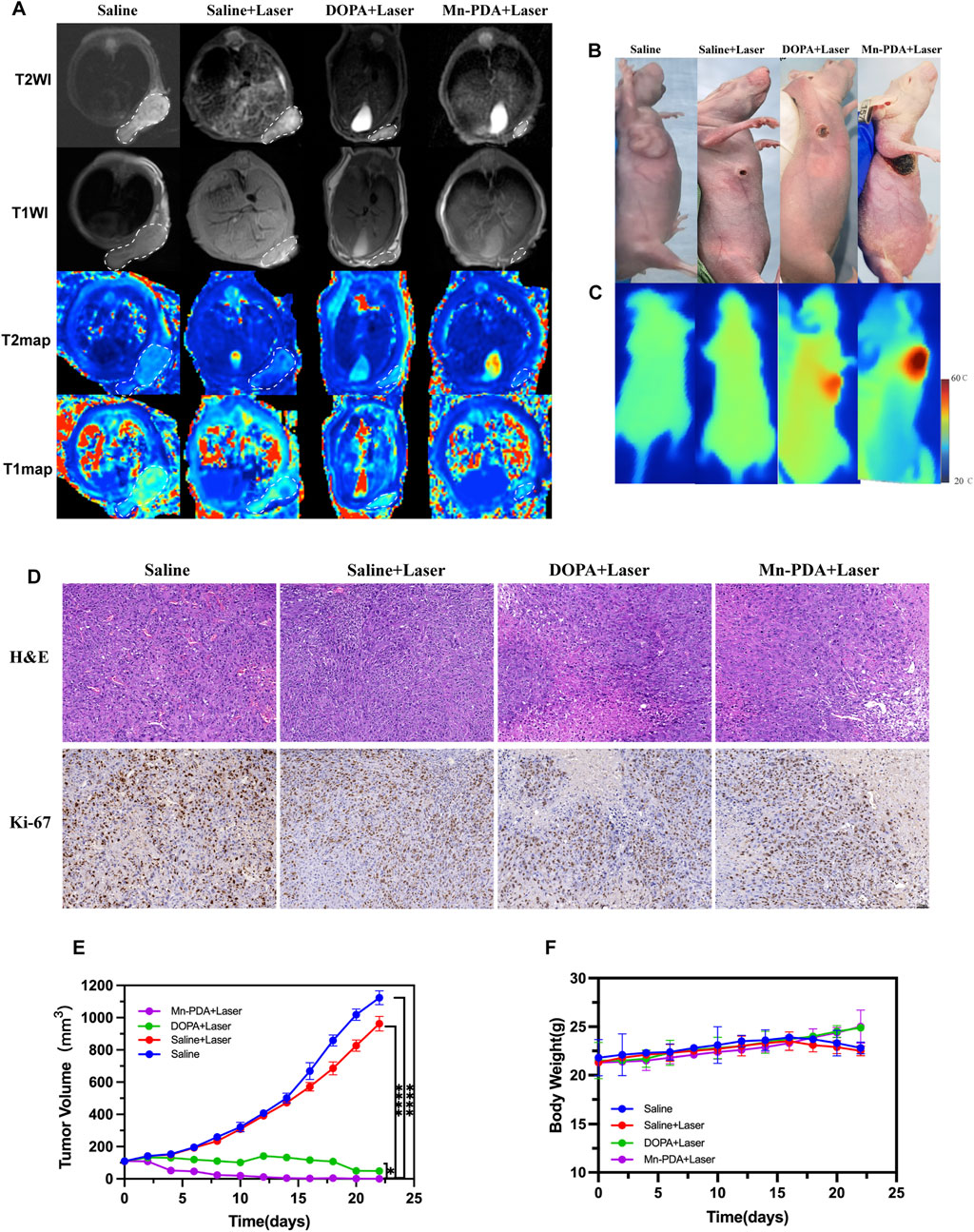 Figure 4. In vivo Therapeutic efficacy and biocompatibility of Mn-PDA NPs. The representative axial MR images of mice from different groups, white dashed box indicate tumor regions (A). Representative photographs (B) and in vivo infrared thermographs (C) of mice post-injection of Saline, DOPA NPs and Mn-PDA NPs under 808 nm laser irradiation (1W/cm2, 5 min). (D) H&E staining and KI-67 IHC of tumor images after treatment (Scale bar: 50 μm. n = 5). (E) Tumor volumes of mice for different treatments. (F) Bodyweight changes of mice after various treatments (n = 5,*P < 0.05, **P < 0.01, ***P < 0.001).