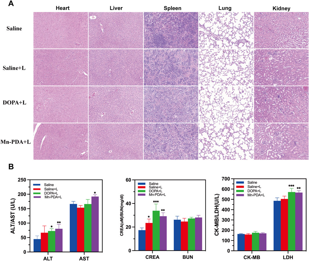 Given the therapeutic efficacy of Mn-PDA NPs + L, its potential organ toxicity was assessed. H&E staining of major organs (heart, liver, spleen, lung, kidney) revealed no pathological abnormalities in any group (Figure 5A). As shown in Figure 5B, the hematological indices, including liver-associated enzymes (AST, ALT), renal function indicators (CRE, BUN), and cardiac biomarkers (CK-MB, LDH), all stayed within normal reference ranges across all experimental groups, suggesting minimal toxicity effects in the tumor-bearing mice. Collectively, Mn-PDA NPs demonstrated good biocompatibility and potent tumor suppression. However, their clinical translation is delayed due to potential toxicity risks, especially the accumulation of free Mn2+ in dopaminergic neurons, which may lead to neurotoxicity. Although some clinical trials (Zhang et al., 2023) and approved agents, like Mn-DPDP (Hamm, et al., 1992), suggest short-term safety ofmanganese-based nanocomposites, there is a lack of long-term toxicological data and animal models that closely mimic humans. Further research is needed to confirm their safety and effectiveness for clinical use.