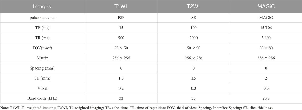 For phantom studies, solutions of Mn-PDA NPs were prepared at varying Mn(II) concentrations (0, 0.01, 0.03, 0.06, 0.13, 0.25 mM). Imaging was performed on a 3.0T MRI scanner (GE Signa Architect) using T1-weighted (T1WI), T2-weighted (T2WI), and MAGiC sequences, quantitative T1map and T2map were derived from the MAGiC data (Zhao et al., 2025). Specific scanning parameters are listed in Table 1. Regions of interest (ROIs) were consistently positioned across samples at the same level to measure longitudinal and transverse relaxation times (T1 and T2). Then longitudinal and transverse relaxivity (r1 and r2) were determined from linear regressions correlating nanoparticle concentration with reciprocal relaxation times.