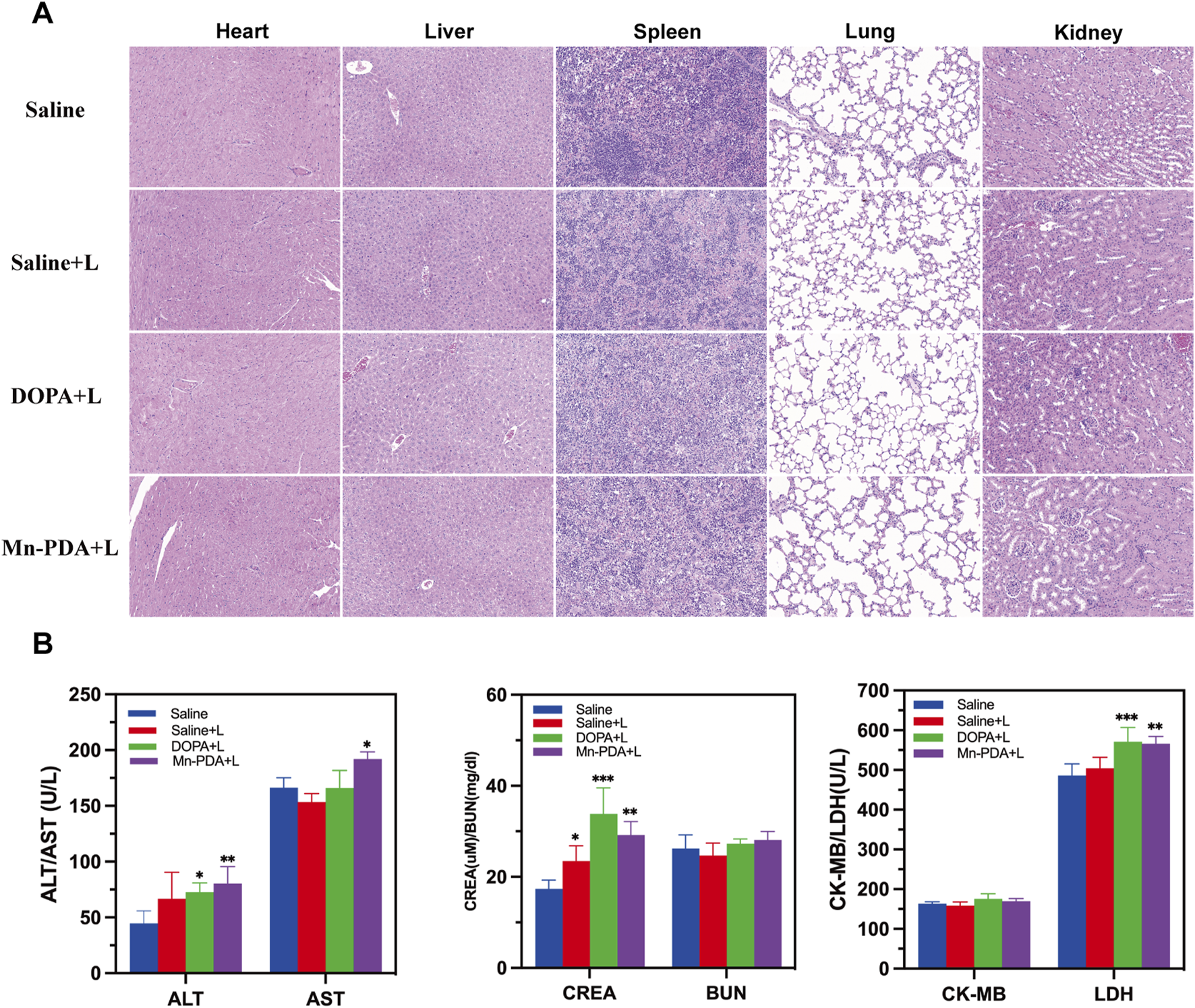 Biosafety of Major Organs after Mn-PDA NPs Treatment. (A) H&E staining of major organs (heart, liver, spleen, lung, kidney) after treatment (scale bar: 50 μm, n = 5). (B) Blood biochemical parameters analysis of major organs (heart, liver, spleen, lung, kidney) after treatment (n = 5, *P < 0.05, **P < 0.01, ***P < 0.001).