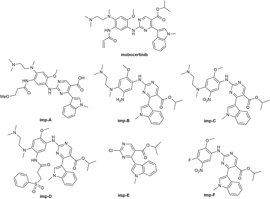 The impurities in mobocertinib (imp-A, B, C, D, E and F) were accurately weighed and diluted to a concentration of 1 mg mL-1, as described above, to prepare standard stock solutions.