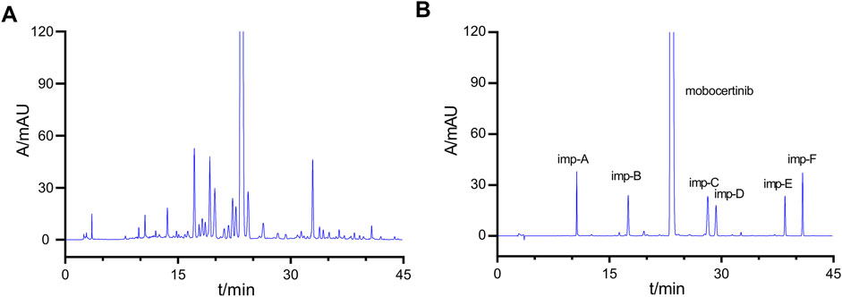 Reversed-phase HPLC (RP-HPLC) is an ideal technique for detecting drugs and their impurities and has been applied to different kinds of drugs (Li et al., 2020; Tome et al., 2020; Wang et al., 2020). The advantages of RP-HPLC include convenience, simplicity, stability, and low cost. Consequently, we developed an RP-HPLC method to detect mobocertinib and its impurities, which is reported here for the first time. The proposed method was validated according to International Conference Harmonization (ICH) guidelines (ICH, 2023). Specifically, mobocertinib and its impurities (imp-A–F) were completely separated. The system suitability and specificity, precision, stability and robustness of the method were subsequently investigated. The lowest limit of detection (LOD), lowest limit of quantitation (LOQ), linearity and recovery of the RP-HPLC method were determined. Notably, a novel substance was discovered in this study. The structure of the substance was resolved successfully through nuclear magnetic resonance (NMR) and high resolution mass spectrometry (HRMS), and the anticancer effect of the substance was evaluated. It is our hope that this novel method will provide an effective way to detect mobocertinib and its impurities and that the newly discovered substance will provide additional treatment options for cancer patients.