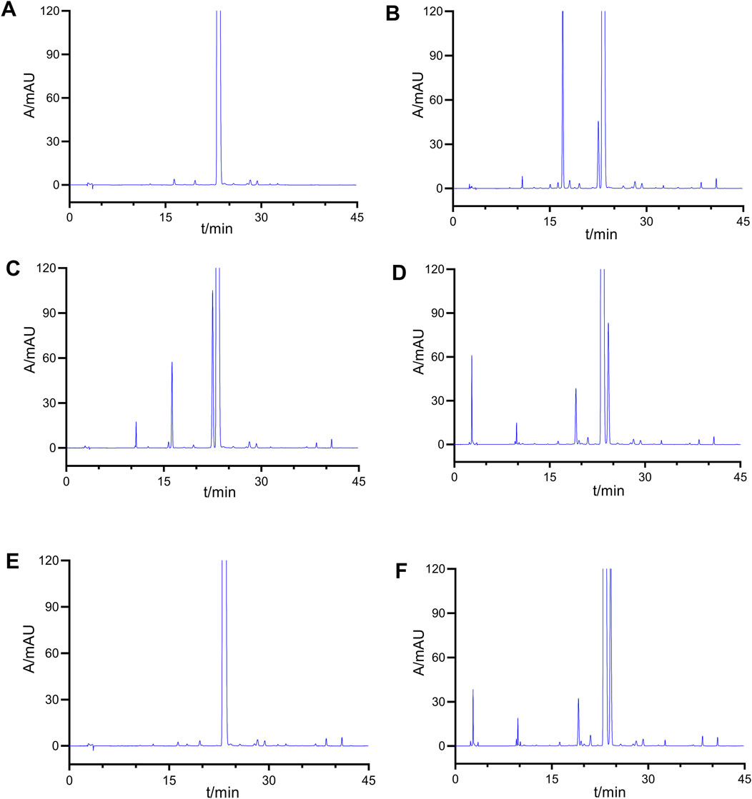 Figure 3. HPLC chromatograms of mobocertinib samples: non-degraded (A), acid-degraded (B), base-degraded (C), oxidatively degraded (D), heat-degraded (E), and photolytically degraded (F).