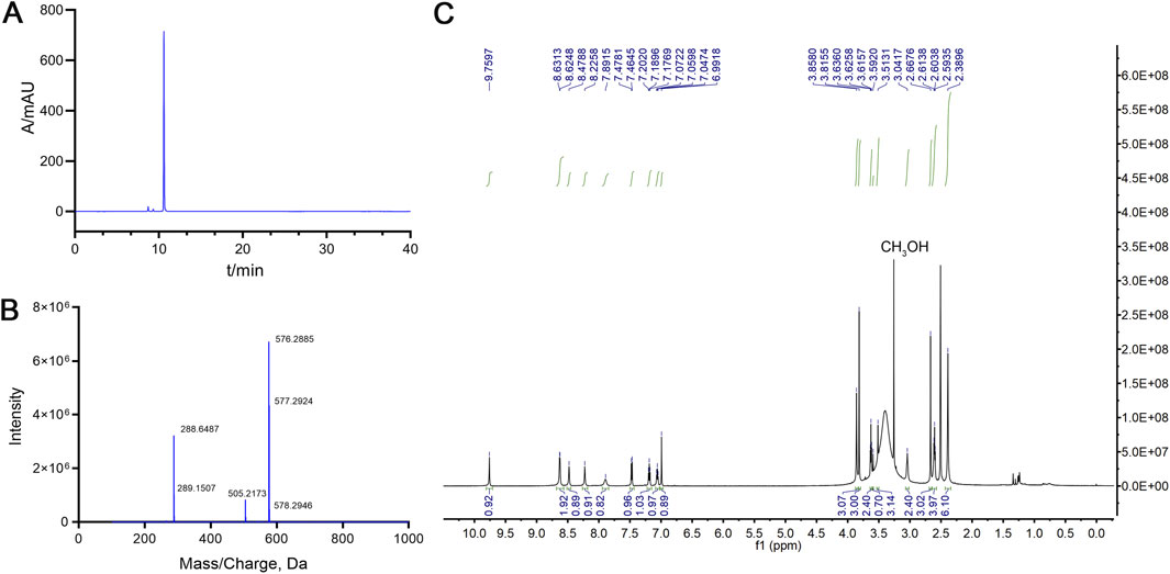 This study was performed using an RP-HPLC instrument (Agilent 1,200, Agilent, United States) equipped with an ultraviolet–visible (UV–vis) spectrometer (Cary 300, Varian, United States) and a Milli-Q water purification system. An RP-HPLC instrument (Shimadzu 20AD, Shimadzu, Japan), NMR instrument (Bruker 600 M, Bruker, Germany) and HRMS (Agilent 6,540, Agilent, United States) were also utilized. In addition, a preparative column (Eclipse XDB-C18, Agilent, United States), a microplate reader (iMark, Bio-Rad, United States), a pH meter (PHS-3C, Leici, China) were used.
