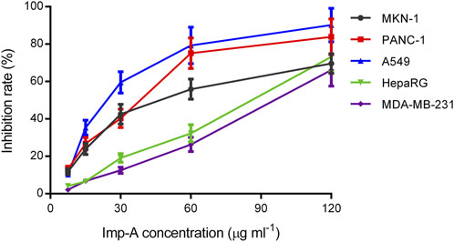 Figure 6. Inhibition rates of MKN-1, PANC-1, A549, HepaRG and MDA-MB-231 cells treated with imp-A at different concentrations.