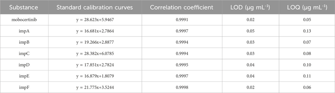 The linearity of mobocertinib and its impurities was investigated in the concentration range of 0.1–20 μg mL-1. Stock solutions of mobocertinib and its impurities were diluted to concentrations of 0.1, 0.2, 0.5, 1, 2, 5, 10, and 20 μg mL-1 with MeOH/H2O (50:50, v:v). Next, 10 μL of each of the prepared solutions were injected and analysed under the HPLC conditions, as described previously. Finally, the linearity of the seven substances was calculated. The regression curves are shown in Supplementary Figure S3, and the standard calibration curves and correlation coefficients are presented in Table 1.