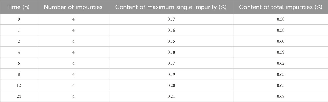 Under the specified conditions, the minimum resolution was 1.61 between the mobocertinib peak and the adjacent impurity peaks and 1.39 (>1.2) between the other impurity peaks. There was no noticeable change in the number or content of impurities. Impurity detection was not affected by variations in the column temperature, wavelength, or pH of the mobile phase. Changes in the flow rate, initial proportion and chromatographic column of the mobile phase had little influence on the retention time or resolution. Fortunately, minor adjustments in these parameters did not noticeably affect the detection results, successfully demonstrating the robustness of the method.