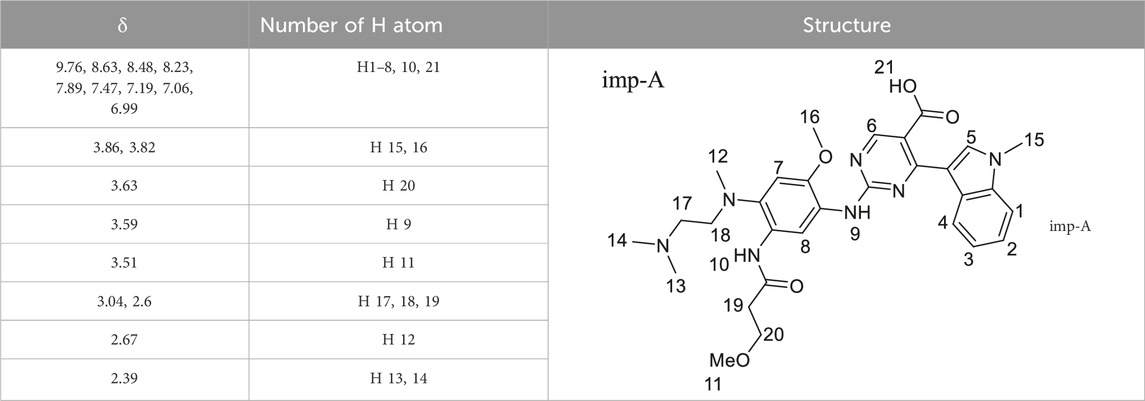 Imp-A was prepared in our laboratory according to the procedure described in Section 2.4. The corresponding chromatogram is presented in Figure 4A. The retention time was 10.74 min. The purity was calculated to be approximately 97.8%. Imp-A was characterized by NMR and HRMS. These techniques are used to identify and quantify the elemental composition of compounds (Wang et al., 2023). The HRMS was used to detect the molecular weight of imp-A, the spectrum is presented in Figure 4B. The molecular weight of imp-A is 575.2885 Da. NMR was used to characterize the structure of imp-A in detail. The 1H NMR spectrum of imp-A are shown in Figure 4C and the signals of H atoms of imp-A are indicated in Table 3. The 13C NMR spectra of imp-A are shown in Supplementary Figure S4. Supplementary Figures S5, S6 exhibit the full HMBC spectrum and locally amplified HMBC spectrum of imp-A, respectively. Through these results, we successfully inferred the structure of imp-A (Figure 1). In addition, the formation mechanism was revealed in Figure 5 which follows a Michael addition reaction mechanism. Since a Michael receptor, α, β-unsaturated amide exists in the structure of mobocertinib, it is prone to be attacked by electron rich group. Under the forced degradation condition (NaOH was used), MeO- formed and the double bond of the Michael receptor was attacked by MeO-. Then, the intermediate underwent keto-enol tautomerism to provide imp-A.