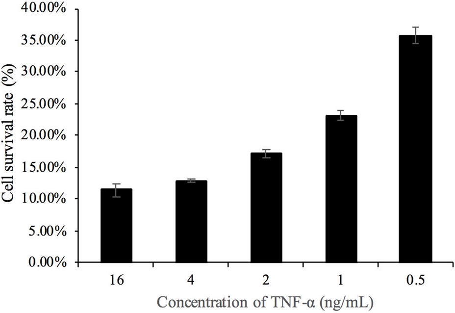 As shown in Figure 3, the cell survival rate significantly decreased at a TNF-α concentration of 1 ng/mL and was 64% at a TNF-α concentration of 4 ng/mL. The concentration of TNF-α was derived from traceable certified value results in Section 3.5.6.