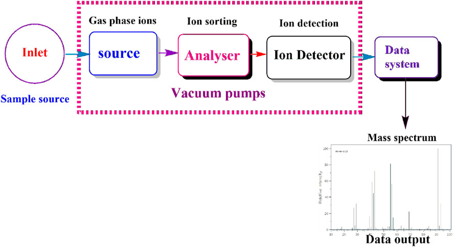 Mass spectroscopy (MS) is another effective and reliable analytical technique used for evaluating the mass-to-charge ratio of ionized particles during the characterization process of bioactive compounds (Thakur, 2020). The significant principle is based on ionization of chemical species to generate charged molecules or fragments, which are subsequently separated in a vacuum based on their mass-to-charge ratios (Brown et al., 2020; Picó, 2020). The resulting mass possesses data concerning the analyte’s molecular weight and structural characteristics, as summarized in (Figure 4), (Géhin and Holman, 2021). MS can also be integrated with chromatographic protocols such as LC-MS aiming at promoting separation and identification capacities for bioactive chemical substances (Picó, 2020). The combination of these protocols has demonstrated to reduce the challenges associated with the study of complicated mixtures, especially those observed in biological samples, making it easier to detect metabolites and other bioactive compounds even at reduced concentrations (Soleiman-Beigi and Ghiasbeigi, 2019). The study done by Abbattista et al. (2021) demonstrated that MS is a useful analytical instrument in the characterisation and identification of secoiridoids and phenolic compounds from olive leaves and pomace wastes. This technique provides an opportunity in targeted and untargeted compounds offering comprehensive characterisation for complex waste extracts.