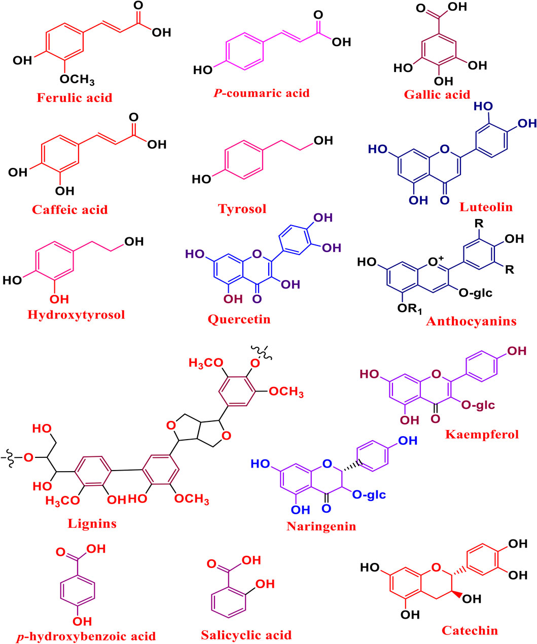 There are several phenolic compounds that have been successfully extracted and purified from various agri-food wastes. Researchers have obtained these essential bioactive compounds from fruit peels, vegetable leaves, cereal bran and tea waste. Studies have demonstrated that AFW, such as orange and lemon peels, rice husks, onion peels, carrot peels, apple peels, tomato peels, potato peels, olive waste, grape waste, wine products, have been shown to possess various phenolic compounds presented in (Figure 5). These AFW residues are also reported to contain high levels of polyphenols, flavonoids and vitamins which are associated with several health-promoting benefits, such as anti-inflammatory and anti-diabetic properties. These phenolic compounds are obtained through the use of various extraction protocols such as UAE, MAE and DES among others. Additionally, phenolic bioactive compounds are recognized for their unique various industrial applications including food, pharmaceuticals and cosmetics (Ben-Othman et al., 2020; Ligianne and Ceccato-Antonini, 2020; Sorrenti et al., 2023; Yadav et al., 2024).