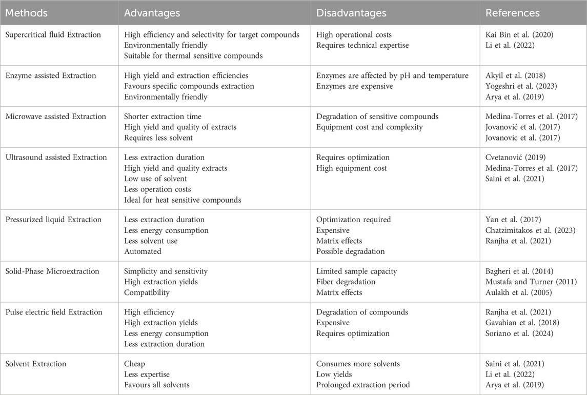 Traditional and emerging protocols require further exploration in order to resolve some setbacks. Traditional protocols depend on toxic chemical reagents and high energy usage, resulting in pollution and emission of greenhouse gases (Barba et al., 2015; Xi et al., 2021). Low selectivity resulting in difficulty in extracting specific compounds from complex plant matrices and waste disposal challenges, especially toxic byproducts. Traditional strategies are also associated with low recovery rates, especially in acid and heat treatment (Blicharski and Oniszczuk, 2017; Frosi et al., 2021). On the other hand, emerging traditional protocols face issues associated with being quite expensive and market competition, requiring industrial validation and resolving health and safety concerns since the environmental and health effects of novel reagents are unknown (Shahid et al., 2016; Verep et al., 2023).