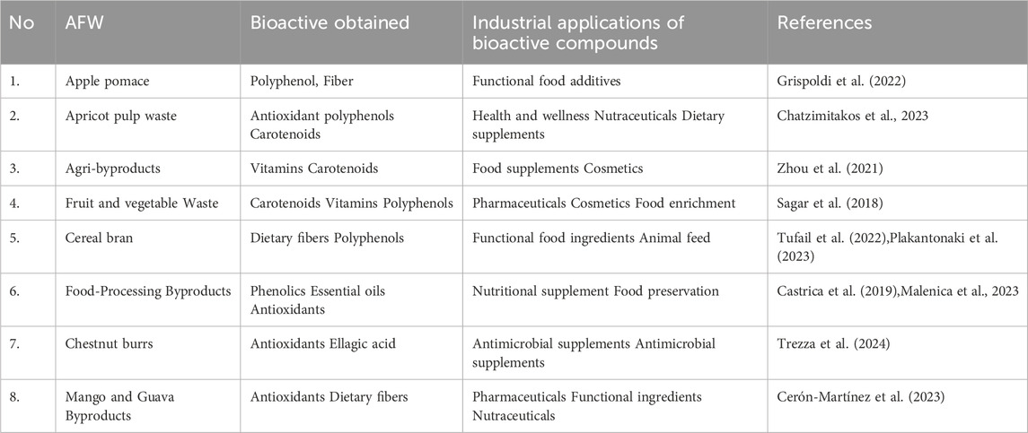 The bioactive compounds derived from various AFW such as fruit peels, leaves, vegetables, cereals and pomace and other plant-related residues have also been explored in food sector due to their health benefits as they possess high content of phytochemicals such as flavonoids, carotenoids and polyphenols (Sagar et al., 2018; Shawky et al., 2025; Zaky et al., 2024). Studies have also confirmed that AFW are incredible sources of bioactive compounds that contain anti-inflammatory, antioxidant and antibacterial characteristics that reduces the risk of chronic infections such as cancer, diabetes and cardiovascular (Ivanišová et al., 2012; Khan et al., 2020; Rojas et al., 2016). Moreover, research has indicated incorporation of phytochemicals ingredient functional foods especially processed foods ensures consumption of clean and safe food products with ideal health benefits (Lankanayaka et al., 2024; Martirosyan and Miller, 2018). Another study has indicated that bioactive compounds extracted from grape byproducts have shown to contain high levels of antioxidant properties making them suitable for promoting food quality and safety (Jara-Palacios, 2019; Rodrigues Machado et al., 2023).