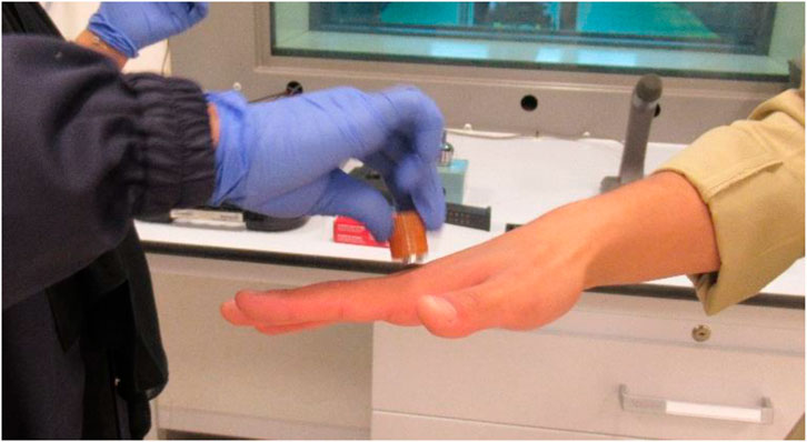 Figure 2. Sample collection procedure: GSR particles being collected from a volunteer’s hand using an aluminum stub coated with carbon tape adhesive.