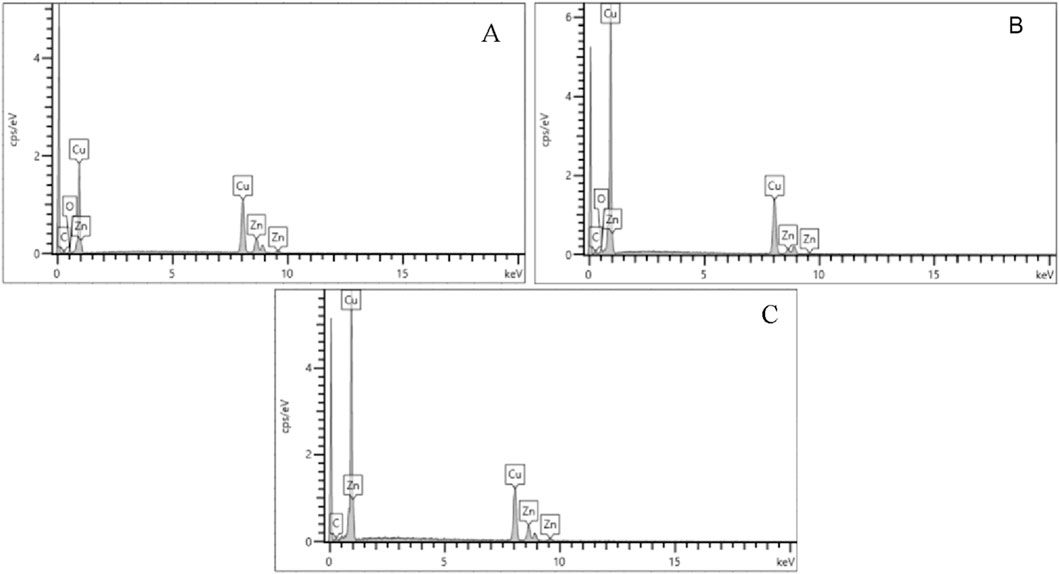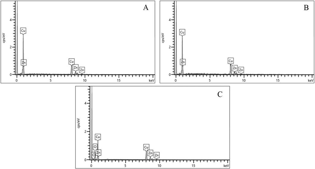 The ADCOM bullet exhibited the highest copper content, reaching ∼90% Cu, which correlates with its distinctive bronze coloration (Figures 3B, 4). In contrast, bullets from Fiocchi NTA and NATO contained lower copper levels, averaging ∼75% Cu, consistent with their relatively lighter, yellowish metallic appearance (Figures 3A,C). This ∼15% difference is forensically significant since bullet jacket composition influences both residual formation and ballistic characteristics. The accompanying EDS spectra (Figure 5) confirms that copper is the dominant element across all bullets, while small alloying differences in Zn may serve as discriminating features when comparing ammunition types.