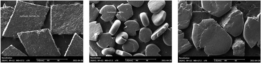 Figure 3. Cartridge case, bullet, gun powder and primer residue on the cartridge case of (A) Fiocchi NTA (B) ADCOM ammunition (C) NATO ammunition.