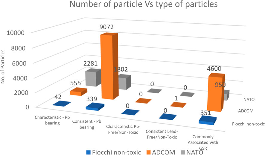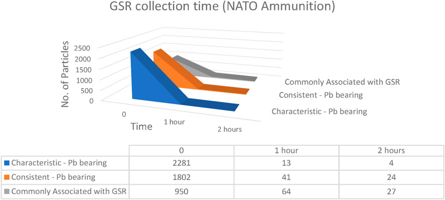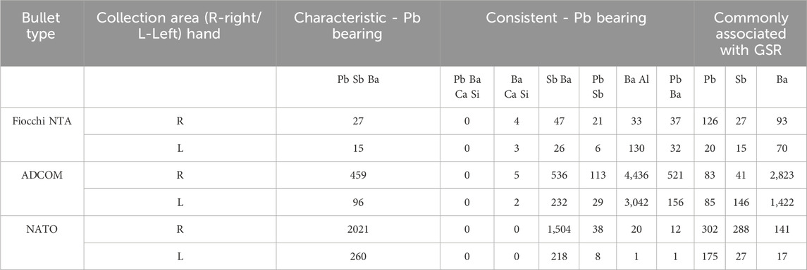For NATO ammunition, the most robust and persistent profile was obtained. At time zero, 2,281 characteristic Pb-bearing particles, 1,802 consistent Pb-bearing particles, and 950 commonly associated particles were detected. After 1 h, these values decreased to 13, 41, and 64 particles, respectively. At 2 h, 4 characteristic particles, 24 consistent particles, and 27 commonly associated particles were still recorded. Unlike Fiocchi and ADCOM, which showed near-complete disappearance of characteristic particles within 2 h, NATO residues remained clearly detectable. The higher persistence of NATO particles suggested that primer chemistry played a dominant role, while variations in particle recovery were further influenced by the shooters’ activities during the post-discharge period (Brożek-Mucha, 2017; Charles et al., 2022).