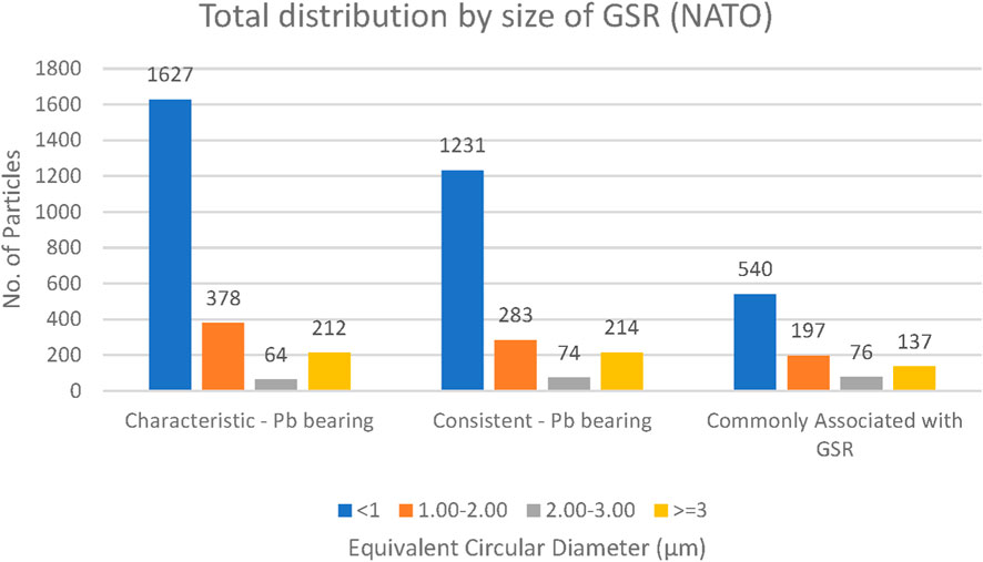 Figure 16. Total distribution of GSR particles size collected from both hands of NATO ammunition (n = 5 shots).