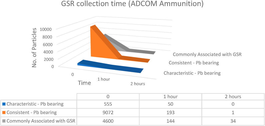 In the case of ADCOM ammunition, much higher initial counts were measured. At discharge, 555 characteristic Pb-bearing particles, 9,072 consistent Pb-bearing particles, and 4,600 commonly associated particles were detected. After 1 h, these values had dropped to 50, 193, and 144 particles, respectively, while at 2 h only 1 consistent particle and 34 commonly associated particles were recorded, with no characteristic Pb-bearing particles remaining. The marked reduction again reflected the influence of physical activities performed by the shooters, which accelerated the loss of loosely attached residues (Rosengarten et al., 2021).