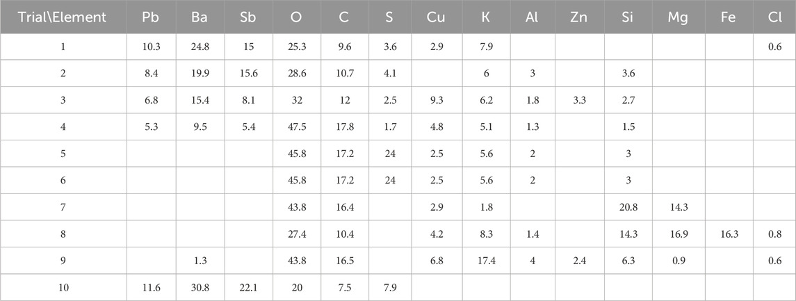 Primer mixture composition analysis of Fiocchi NTA ammunition revealed the unexpected presence of lead (∼5–10%), although it is marketed as heavy metal-free ammunition (Table 2). This concentration, however, is significantly lower than the lead content in typical toxic ammunition (∼21–42%), as shown in Tables 3, 4. Additionally, the Fiocchi NTA ammunition included elements such as silicon, magnesium, chlorine, and iron, commonly found in sand, a known component of NTA ammunition (Black et al., 2021). Some Fiocchi NTA samples exhibited typical toxic GSR composition (Pb-Ba-Sb), whereas others displayed a composition aligned with non-toxic GSR elements (Cu, K, Al, Zn, Si, Mg, Fe), indicating a hybrid composition aiming to reduce overall toxicity (Table 2). A limitation of this study is that only a single lot per ammunition type was examined, which may not fully capture variability across different manufacturing batches; nonetheless, the findings remain consistent with international reports of residual lead in certain “non-toxic” primers.