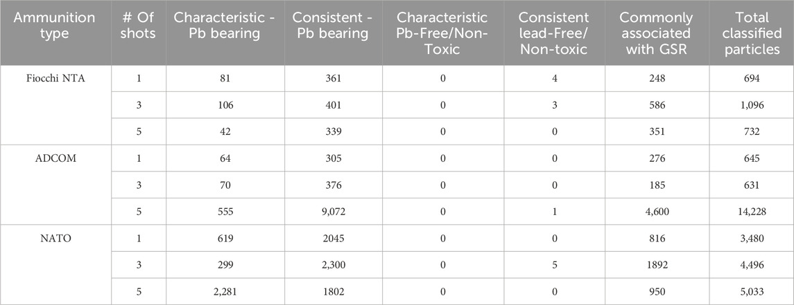 For Fiocchi NTA, particle recovery did not scale with the number of shots. After a single shot, 694 total classified particles were detected, including 81 characteristic Pb-bearing and 361 consistent Pb-bearing particles. Following three shots, the total increased modestly to 1,096 particles, yet the proportion of characteristic Pb-bearing particles remained low (106 particles). Unexpectedly, after five shots, the total count decreased to 732 particles, with only 42 characteristic Pb-bearing particles detected. This irregular pattern suggested that Fiocchi residues were deposited inconsistently, likely due to the hybrid primer chemistry generating lower and less stable particle yields, which were more susceptible to loss through handling activities (Rosengarten et al., 2021; Werner et al., 2020).