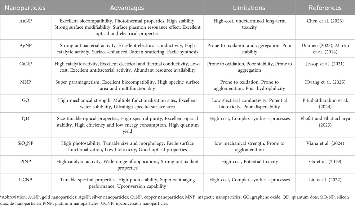 SERS technology demonstrates exceptional sensitivity and resolution not only in genetic-level analyses but also in disease subtyping, pathogen identification, and viral infection detection (AlSafadi et al., 2024; Chen et al., 2025; He et al., 2024; Ye et al., 2022). Although nanoparticle-based detection technologies possess great potential for sensitivity and specificity, the toxicity of such particles is still nonnegligible. The exploration of nanoparticle biocompatibility and biodegradability is of priority to future research. Thus, analytical performance must be balanced against potential biological hazards to ensure safe diagnostic applications (Brunelli et al., 2024; Ruijter et al., 2023).
