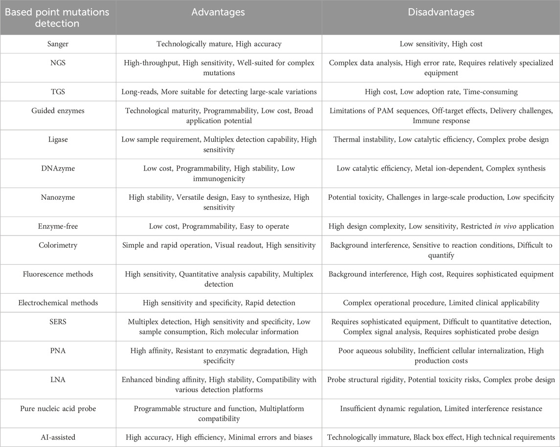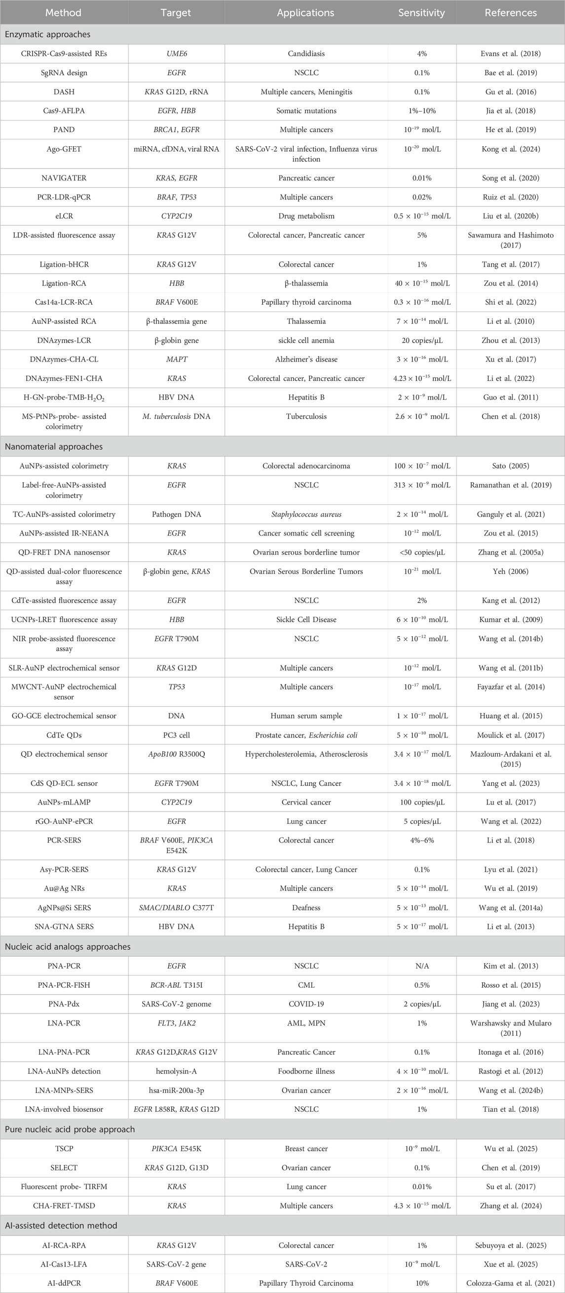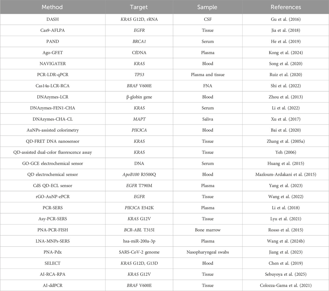 Point mutation refers to an alteration that occurs at a single nucleotide of a DNA molecule, characterized by the substitution, insertion, or deletion of only one nucleotide in the DNA sequence. Mutated genes typically trigger a cascade of detectable biological alterations, including changes in protein expression and function, changes in RNA expression, epigenetic modifications (e.g., DNA methylation, histone modifications), and variations in metabolite profiles (Eriksson et al., 2017; Ho et al., 2008). Numerous genetic disorders and cancers originate from gene mutations that cause dysregulation of functional proteins. Among the most frequently mutated genes, EGFR, TP53, and KRAS are associated with diverse malignancies including non-small cell lung cancer (NSCLC) (Bai et al., 2024; Mao et al., 2021), colorectal carcinoma (Adorisio et al., 2025; Kim et al., 2020), and pancreatic cancer (Hashimoto et al., 2016; McCubrey et al., 2022). Detection of point mutations facilitates the early diagnosis of genetic diseases and the screening of carriers, while also contributing to the molecular subtyping of tumor-related diseases and guiding precision medicine. In addition, resistance in bacteria, viruses, and parasites is often mediated by point mutations (Carter et al., 2015; Menard and Dondorp, 2017), and identifying these mutations is valuable for clinical treatment and epidemiological prevention and control. Nevertheless, this process confronts significant technical challenges, notably the low concentration level of the target and interference from complex sample matrices.