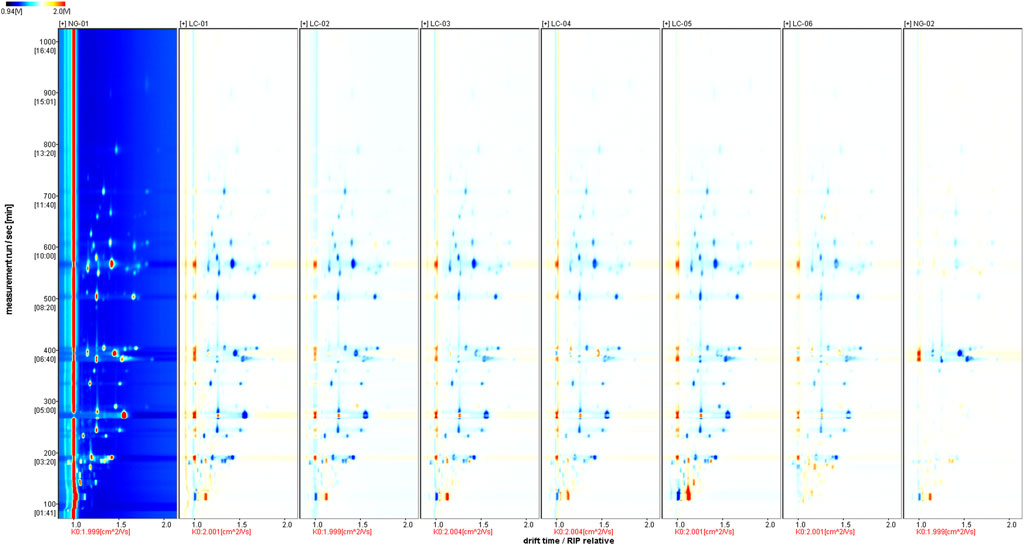 Figure 3 shows the spectrum of the NC-01 sample selected as a reference. The reason for selecting NC-01 as the reference sample is primarily that the VOCs of serum in patients without HCC represent the baseline level. By comparing these components, we can identify which components in the serum of HCC patients deviate significantly from the normal range in terms of content or proportion, thereby screening out specific biomarkers associated with HCC. This lays the foundation for efficiently identifying differences in VOCs of serum related to HCC. The spectra of the other samples were subtracted from the reference to obtain a comparison chart of the differences between different samples. As long as the volatile organic compound content in the target sample and the reference sample is the same, the subtracted background will be white. In the spectra of other target samples, red indicates that the concentration of a compound in the target sample is higher than the reference concentration, and blue indicates that it is lower. We can clearly see the differences in ionized VOCs signals between patients with HCC and patients without HCC through the differential spectra.