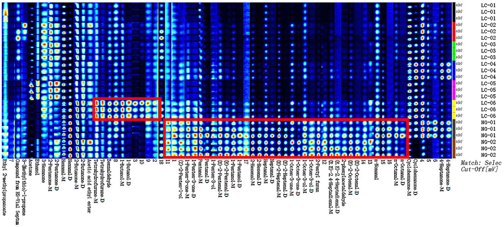 To further compare the VOCs in different serum samples, fingerprint analysis was performed on all VOCs, and the results are shown in Figure 4. This Figure shows all selected signal peaks from a sample in rows, and each volatile organic compound’s signal peak in columns. A grid shows a higher content if the color is brighter. Through comparative analysis of the volatile substances detected in different serum samples, it was found that there are significant differences in the VOCs detected in the serum of patients with and without HCC. The results indicate differences in the content of n-Octanal, n-Nonanal, (E)-2-Octenal, 2-phenylacetaldehyde, (E.E)-2.4-Heptadienal, 2-Pentyl furan, 1-Octen-3-ol, 1-Octen-3-one, (E)-2-Heptenal, Heptanal, 2-Hexenal, 1-Pentanol, (E)-2-Pentenal, 1-Penten-3-ol, Pentanal, 1-Penten-3-one and (Z)-2-Penten-1-ol. Their contents are all higher in NG-01 and NG-02; that is, their contents are higher in the serum of patients without HCC and are very low in the serum of patients with HCC. The contents of tetrahydrofuran, Benzaldehyde, and 1-Butanol were higher in the LC-06 sample, while they were very low in the other patients with HCC and in patients without HCC.