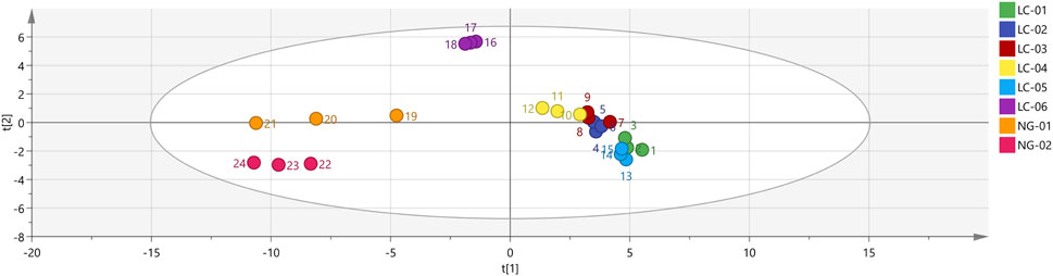 PCA is a data representation method used for feature extraction and dimensionality reduction. This method converts many potentially related variables into a small number of unrelated variables, providing an overview of category separation, clustering, and outliers. PCA visualizes the model, making it easy to understand and avoiding subjective judgments. PCA of the VOCs detected in the serum samples from patients with and without HCC was performed using Origin 2024b software for LC-01, LC-02, LC-03, LC-04, LC-05, LC-06, NG-01, and NG-02. The results are shown in Figure 5. The contribution rate of PC1 is 61.7%, the contribution rate of PC2 is 12.4%, and the cumulative contribution rate reaches 74.1%. The distances between samples LC-01, LC-02, LC-03, LC-04, and LC-05 are relatively small, indicating that their differences are small. However, there is a significant gap between the six LC groups and the two NG groups, indicating that there is a large difference in serum VOCs between patients with HCC and patients without HCC. The serum VOCs of patients with HCC and patients without HCC were classified using PCA, confirming that there is a significant difference in serum VOCs between these two groups of patients. The LC-06 contains some different VOCs, which may be related to its comorbidities.