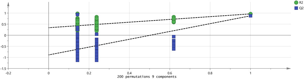 To better observe the differences between groups, a PLS-DA model was established for patients with HCC and patients without HCC. PLS-DA is a statistical method for supervised discriminant analysis that is different from PCA. It can interpret observations and make predictions for corresponding variables. Eight sets of sample data were imported into SIMCA software for analysis, and the results are shown in Figure 6. In the PLS-DA model, R2 and Q2 are used to evaluate the model reliability and predictive ability, respectively. Values of R2 and Q2 greater than 0.5 indicate acceptable model fitting, while a value close to 1 indicates strong predictive ability. The PLS-DA scoring chart shows that the PLS-DA model has good predictive ability (R2X = 0.987, R2Y = 0.976, Q2 = 0.899). The values of R2 and Q2 are close to 1, indicating good fitting accuracy. LC-01, LC-02, LC-03, LC-04, and LC-05 are distributed on the right side of the graph, while NG-01 and NG-02 are on the left side of the graph, presenting distant clusters and indicating significant differences in VOCs in the serum of patients with HCC and patients without HCC; these findings are consistent with the conclusion drawn from the PCA graph. In addition, the predicted variable importance in projection (VIP)>1 is used as a standard to measure the strength and explanatory power of the expression pattern of the compounds for the classification discrimination of each group of samples, assisting in the screening of the main distinguishing peaks between samples. As shown in Figure 7, 3-(Methylthio)-1-propene, Acetone, Acetic acid ethyl ester, 2-Pentanone, 2-Butanone, 1-Butanol, 4-Heptanone, 4-Heptanone, Cyclohexanone, Ethyl 2-methylpropanate, Cyclohexanone, 2-Butanone, n-Nonanal, 3-Hexanone, 1-Butanol, n-Octanal, Hexanal, Tetrahydrofuran, Ethanol, n-Octanal, and Benzaldehydryl are the main indicator components of the difference. To determine whether the model is overfit, we conducted 200 cross-validations to examine the R2 and Q2 values. From the graph, we observed that the slope of the line is large, indicating that the PLS-DA model is not overfit (R2 = 0.339, Q2 = −0.889; as shown in Figure 8.