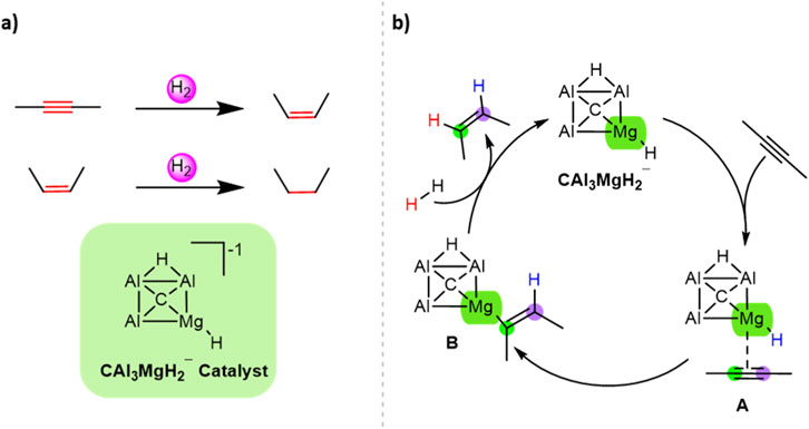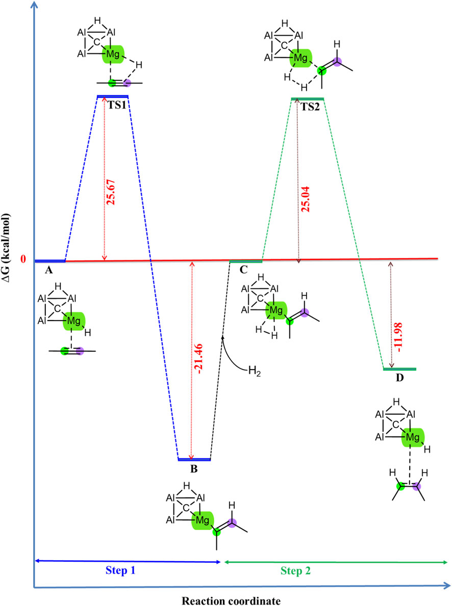 The investigation of the hydrogenation of 2-butyne and 2-butene employing CAl3MgH2¯ as a catalyst is shown in Figure 1a, and the proposed mechanism is illustrated in Figure 1b. In this mechanism, the 2-butyne first coordinates with the magnesium center to form reactant state A. Subsequently, the 2-butyne inserts into the Mg–H bond, leading to an Mg–C bond in B. Then, H2 is added to the Mg–C bond to produce the desired product 2-butene, and the catalyst is regenerated.