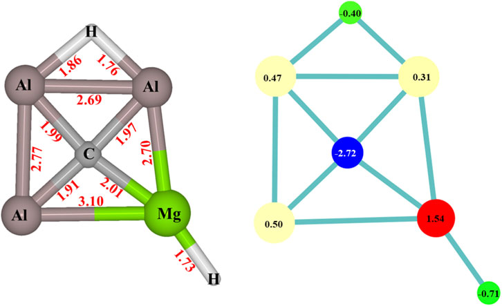 Figure 2. CAl3MgH2¯ with bond lengths (Å) on the left side, and natural atomic charges (|e|) on the right side at ωB97XD/6–311++G (2d,2p) level of theory.