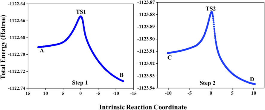 The identification of transition states was achieved through the Berny algorithm implemented in the Gaussian 16 package, with a specific focus on the hydrogenation of 2-butyne using CAl3MgH2¯. To verify the predicted reaction mechanism of hydrogenation of 2-butyne using CAl3MgH2¯ catalyst, the IRC calculations were conducted as shown in Figure 4. IRC calculation is employed to explore the minimum energy pathways of chemical reactions. It determines the path a system follows from a transition state to connecting the local minima, which corresponds to a stable reactant or product. This process is crucial for understanding the dynamics of chemical reactions, providing an extensive overview of how reactants are systematically converted into products. Both transition state structures, TS1 and TS2, were subjected to IRC calculations, which demonstrate that the transition states are truly connected to the reactants and products. This provides strong validation that the calculated reaction pathway is a minimum energy pathway.