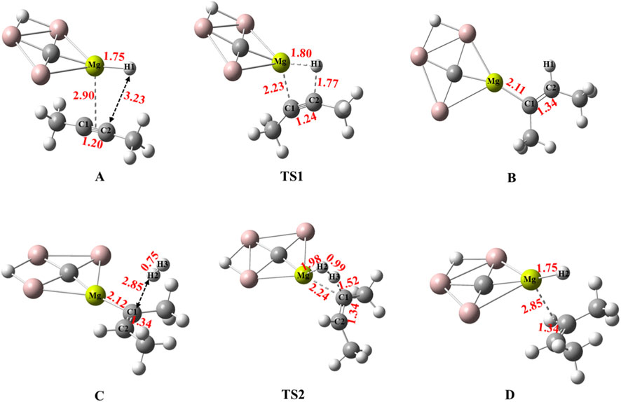 Figure 5. Calculated bond lengths in Å for optimized structures of all the stationary points involved in the reaction pathway of hydrogenation of 2-butyne in the PCM solvation of toluene using CAl3MgH2¯ catalyst at ωB97XD/6–311++G (2d,2p) level of theory. The elongation of the Mg–H1 bond in TS1 confirms the transfer of H1. In TS2, the elongation of H2 confirms its cleavage.