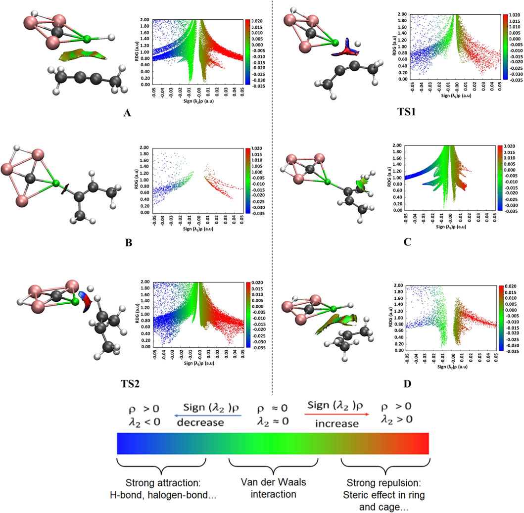 The NCI analysis was conducted using converged Self-Consistent Field (SCF) calculations with cutoff values of 0.5 to gain insights into the type of interactions that happen during the hydrogenation of 2-butyne using the CAl3MgH2¯ catalyst. This involved generating 3D isosurfaces and 2D reduced density gradient (RDG) graphs for all the stationary points along the reaction pathway, as illustrated in Figure 6. This figure specifically highlights the interactions associated with bond breaking and formation. For a comprehensive view, the complete 3D isosurfaces and their corresponding RDG graphs are given in Supplementary Figure S2. The atom labels used here follow as shown in Figure 5. The natural bonding orbital analysis was conducted to understand the orbital interactions that lead to bond formation. The results of this analysis are presented in Supplementary Table S2. It serves to complement the NCI studies through the decomposition of the Wiberg bond order within the framework of natural atomic orbitals. In reactant state A, the green patches represent van der Waals interactions, indicating coordination between the reactants for initiating the reaction process. Upon entering transition state TS1, the blue patches observed between the C2 and H1 atoms indicate a strong attraction stemming from the orbital interaction between 2py (C2)–1s (H1), exhibiting a contribution of 0.11 (see Supplementary Table S2). These interactions play a crucial role in facilitating bond formation between C2–H1, followed by the formation of the bond between Mg–C1, which leads to the formation of intermediate B. In reactant state C, the H2 molecule exhibits van der Waals interactions with the C1–C2 double bond, which leads to the TS2. In TS2, the bonding occurs between C1–H3 (2pz (C1)–1s (H3) contributing 0.19) due to significant orbital interactions. Simultaneously, bond formation takes place between Mg–H2, which is indicated by the blue patches. This process leads to the regeneration of the catalyst and ultimately results in the formation of the desired product in state D. Additionally, in state D, the presence of green patches between the catalyst and 2-butene suggests that the product complex is stabilized through van der Waals interactions.