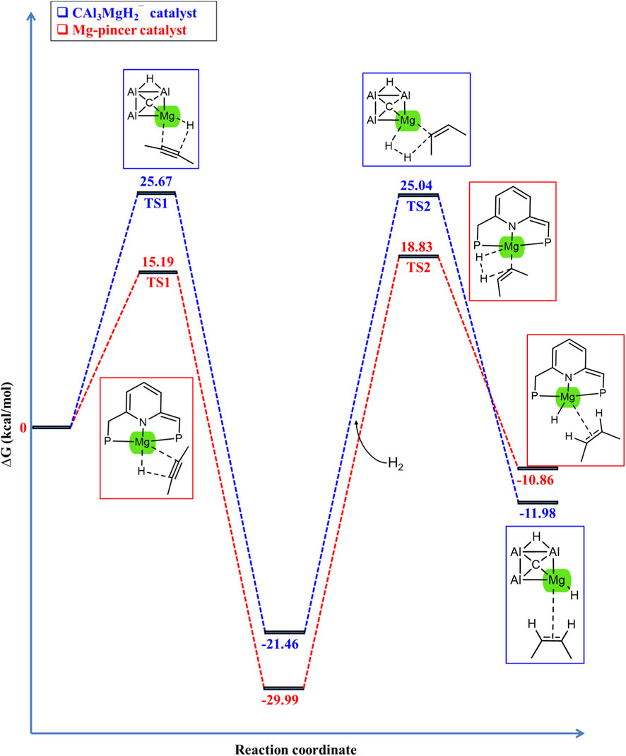 Figure 7. Comparison of Gibbs free energy profile in kcal/mol for hydrogenation of 2-butyne in the PCM solvation of toluene between CAl3MgH2¯ and magnesium pincer catalyst at ωB97XD/6–311++G (2d,2p) level of theory.
