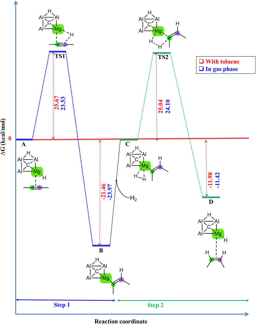 Table 2. Comparison between ΔG, ΔE + ZPVE, and ΔE energies in kcal/mol for hydrogenation of 2-butyne in both gas phase and in PCM solvation of toluene using CAl3MgH2¯ catalyst. The lower activation barrier in the gas phase favors the reaction kinetically compared to the solvent phase. All energies are calculated at ωB97XD/6–311++G (2d,2p) level of theory.