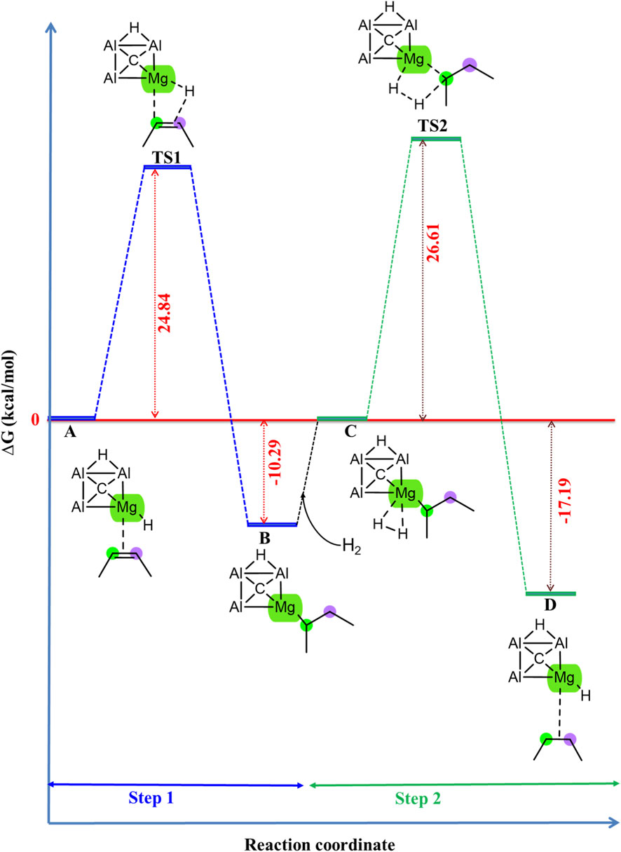 Figure 9. Gibbs free energy profile in kcal/mol of hydrogenation of 2-butene in the PCM solvation of toluene using CAl3MgH2¯ catalyst. The reaction proceeds via two transition states with activation barriers of 24.84 kcal/mol for TS1 and 26.61 kcal/mol for TS2. All energies are calculated at ωB97XD/6–311++G (2d,2p) level of theory.