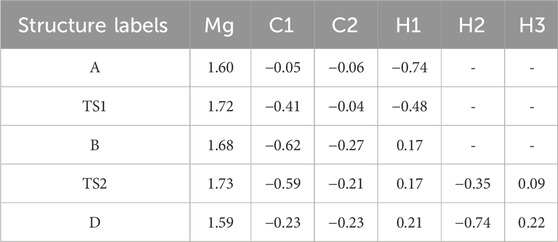 The CAl3MgH2¯ catalyst was meticulously analyzed using various quantum chemical tools, confirming its planar and stable nature, previously reported as a global minimum structure (Malhan and Thirumoorthy, 2024). Figure 2 illustrates the structure of CAl3MgH2¯ along with bond lengths and natural atomic charges. The natural atomic charges from the natural population analysis of bridging and terminal hydride are −0.40 |e| and −0.71 |e|, respectively. The bridging hydride exhibits lower hydridic properties than the terminal hydride and is overlapped with two aluminum atoms, making it challenging for the bridging hydrogen to partake in reactions. On the other hand, the terminal hydride, attached to magnesium with a higher hydridic nature, is more readily available to engage in reactions.