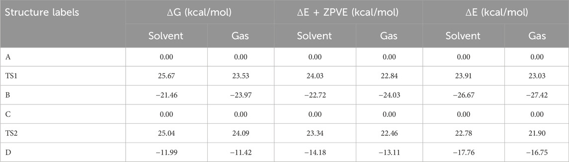 In 2022, Liang et al. conducted both experimental and theoretical studies on the hydrogenation of 2-butyne using a magnesium pincer complex as a catalyst (Liang et al., 2022). The CAl3MgH2¯ may exhibit a similar mechanism to the experimentally reported magnesium pincer catalyst (Liang et al., 2022). Thus, we re-optimized the energy profile of the σ-bond metathesis pathway (similar to the proposed mechanism in the present work, as shown in Figure 1). The Gibbs free energy profile for the hydrogenation of 2-butyne by using the magnesium pincer catalyst is given in Supplementary Figure S3, calculated at the ωB97XD/6–311++G (2d,2p) level of theory, including the PCM solvation of toluene at room temperature (298.15 K) and 5 bar pressure through thermochemical calculations. Additionally, the zero-point corrected energy profile is given in Supplementary Figure S4, the ZPVE corrections, and the number of imaginary frequencies of all the optimized structures of the stationary points involved in the reaction pathway of hydrogenation of 2-butyne using the magnesium pincer catalyst at the ωB97XD/6–311++G (2d,2p) level of theory are listed in Supplementary Table S3. The transition states, TS1 and TS2, exhibit one imaginary frequency each, confirming that they are first-order saddle points along the reaction pathway. In contrast, structures A, B, C, and D have zero imaginary frequencies, indicating that they are minima along the reaction pathway.