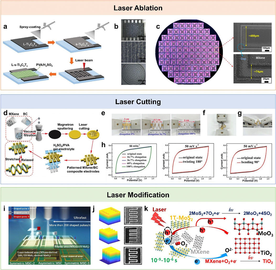 Laser-based fabrication offers powerful, versatile routes for developing MXene-based planar MSCs. Laser ablation enables maskless patterning of interdigitated electrodes for compact on-chip MSCs. Laser cutting excels on flexible substrates, producing stretchable, bendable, and twistable MSC arrays with exceptional mechanical adaptability. Laser modification leverages localized photothermal and photochemical effects to tailor microstructure and surface chemistry, significantly improving ion transport and energy storage performance. Toward real-world applications, laser-fabricated MXene-based MSCs offer significant opportunities for industrial translation. Their compatibility with wearable electronics, portable power modules, and IoT devices highlights the potential to bridge laboratory advances with practical commercialization.