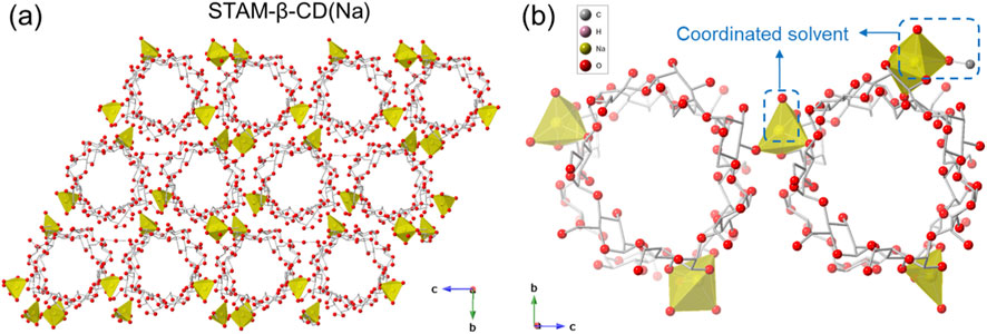 Figure 1. (a) Packing diagram of STAM-β-CD(Na) along a-axis, and (b) Local coordination environment around Na+ cation, showing coordinated solvent (water and methanol) molecules. (Colour code: Na, yellow; O, red; C, grey. H-atoms and uncoordinated solvent molecules are omitted for clarity. Na atoms represented as polyhedral; O atoms are represented in balls; C atoms are shown as sticks).