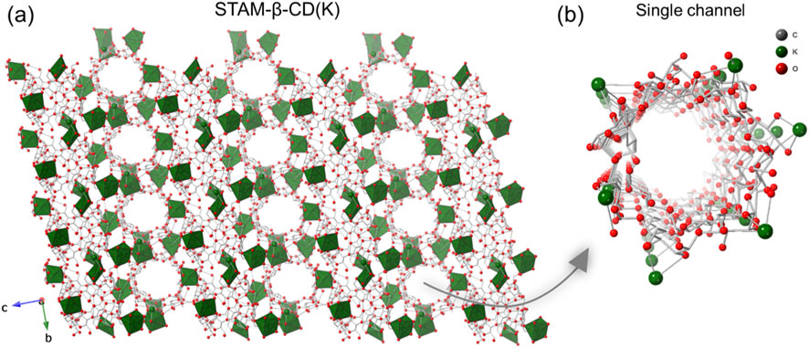 Figure 2. (a) Packing diagram of STAM-β-CD(K) along a-axis, and (b) perspective view of a single nanoporous channel in the MOF. (Colour code: K, green; O, red; C, grey. H-atoms and solvent molecules occupying the voids are omitted for clarity. K atoms represented as polyhedral in (a) and balls in (b); O atoms are represented in balls; C atoms are shown as sticks).