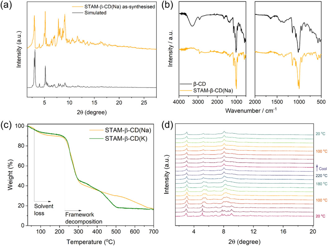 Figure 3. (a) PXRD profiles for STAM-β-CD(Na), simulated (grey) and as-synthesised phase (dark yellow). (b) FT-IR spectra for FT-IR spectra for β-CD (black) and as-synthesized STAM-β-CD(Na) (dark yellow). (c) TGA profiles for STAM-β-CD(Na) (yellow) and STAM-β-CD(K) (green). (d) VT-PXRD profiles for STAM-β-CD(Na) for heating the sample in a sealed capillary up to 220 °C, in stepwise increments of 20 °C.