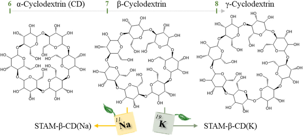 Scheme 1. Overview of α, β and γ-Cyclodextrin (CD) and the use of β-CD for preparing STAM-β-CD(Na) and STAM-β-CD(K) MOFs.